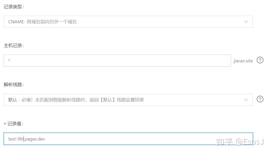 类型选择CNAME,主机记录可以根据需求选择你想用哪一个域名跳转,我选择*(泛解析),即匹配所有 *.你的二级域名.你的顶级域名