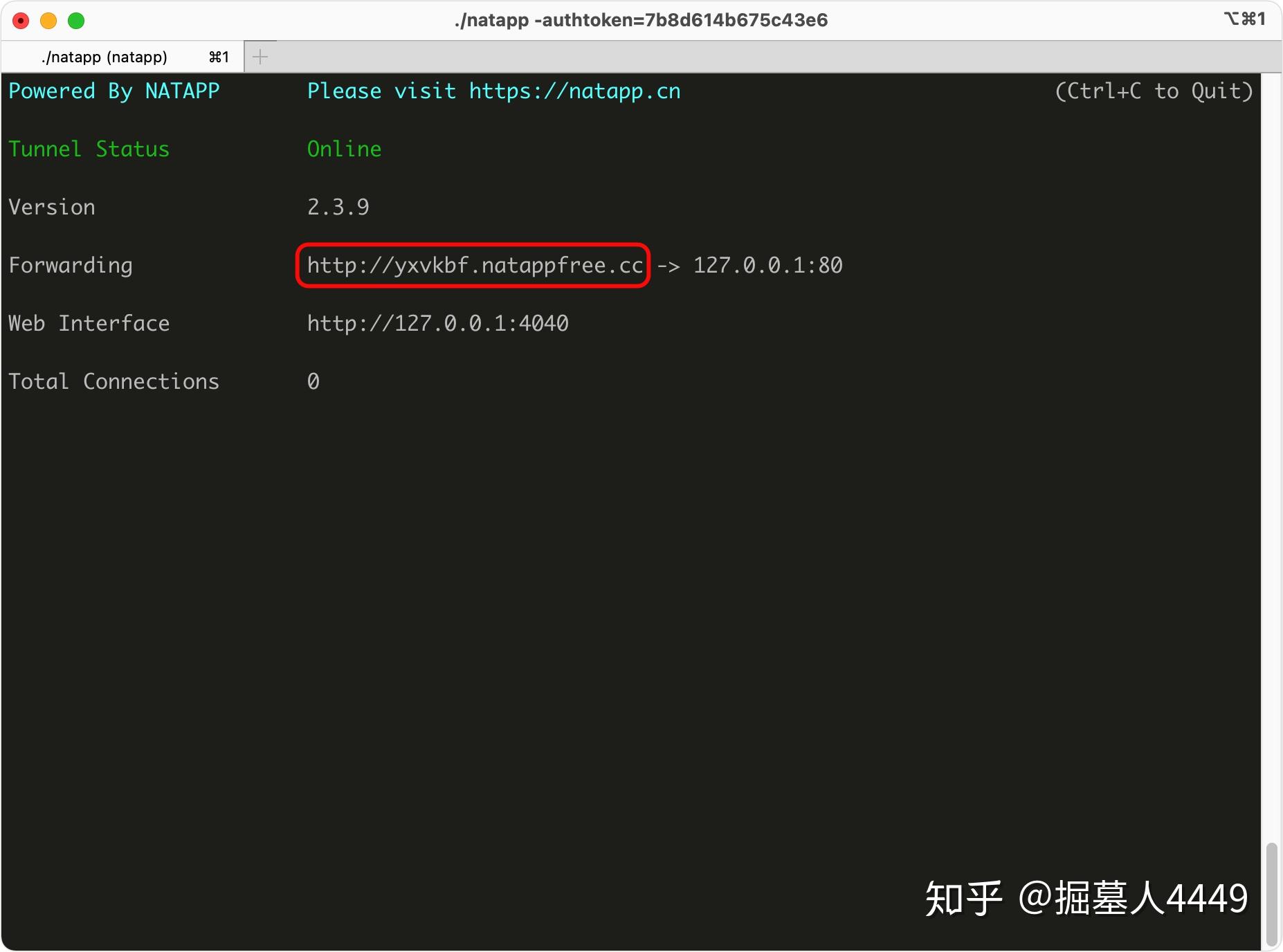 - 在终端执行 ./natapp -authtoken=上面查看到的 authtoken,然后访问圈住的链接即可。